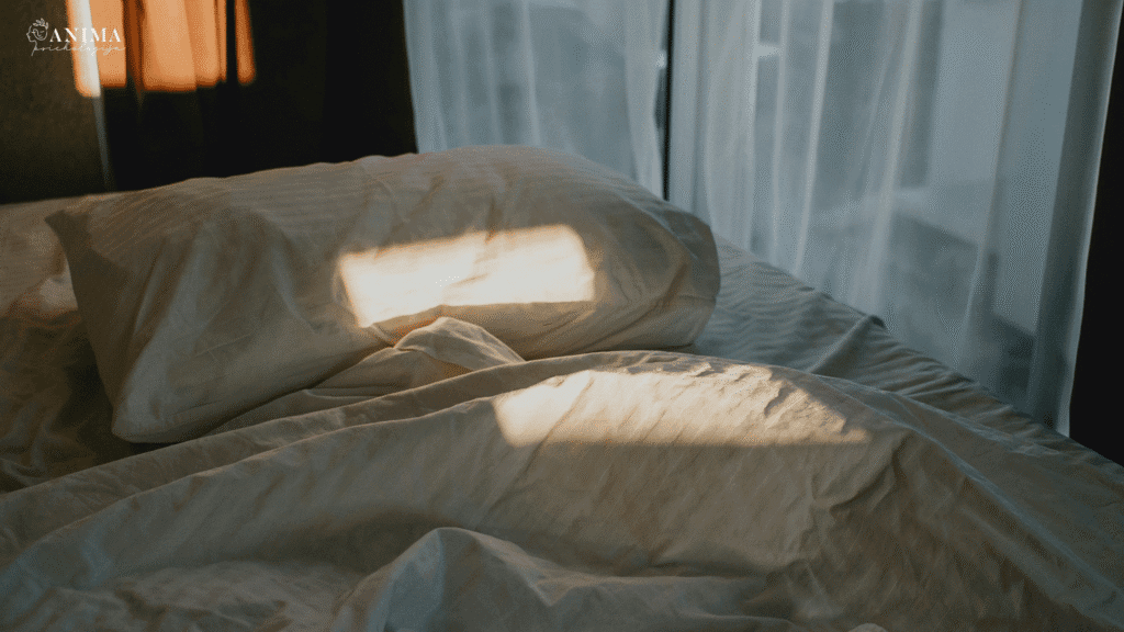 • Užmigimo sunkumai: ilgai neužmiegate (daugiau nei 30 min.), neramios mintys ar nerimas trukdo atsipalaiduoti;